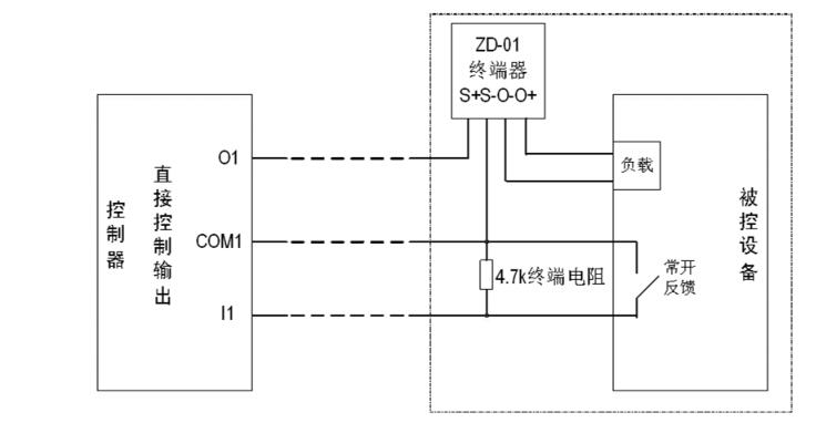 O、COM:組成直接控制輸出端,通過ZD-01終端器與負載連接,O為輸出端正極,COM為輸出端負極,啟動后O與COM之間輸出DC24V。