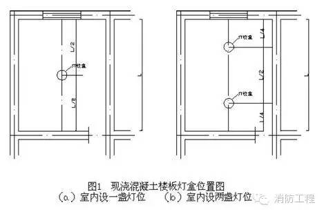 ⑴在配管前應(yīng)按設(shè)計(jì)圖紙確定好配電設(shè)備、各種箱、盒及用電設(shè)備位置。在樓板內(nèi)配管時(shí),在土建摸板支設(shè)完畢后,根據(jù)設(shè)計(jì)圖紙?jiān)诿迳嫌眉t油漆標(biāo)注燈具、插座、探測(cè)器、接線盒、配電箱的位置。當(dāng)室內(nèi)只有一盞燈時(shí),其燈位盒應(yīng)設(shè)在縱橫墻(或梁)凈尺寸中心線的交叉處;有兩盞燈時(shí),燈位盒應(yīng)設(shè)在短軸線墻(或梁)凈尺寸中心線與長(zhǎng)軸線墻(或梁)凈尺寸1/4 的交叉處,如圖1 所示。公共建筑走廊照明燈具,應(yīng)按其頂部建筑結(jié)構(gòu)不同,來合理地布置燈位盒的位置,當(dāng)走廊頂部無凸出樓板下部的梁時(shí),除考慮好樓梯對(duì)應(yīng)處的燈位盒外,其他燈位盒宜沿走廊中心線均勻分布,如走廊頂部有凸出樓板下部的梁,確定燈位時(shí),應(yīng)考慮到燈位與梁的位置關(guān)系,燈位盒與梁之間的距離應(yīng)協(xié)調(diào),均勻一致,力求實(shí)用美觀。