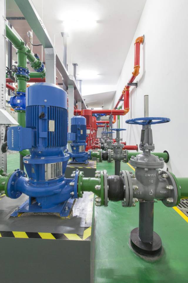 生活水泵與消防泵房設備安裝牢固,不銹鋼管與碳鋼管道隔絕,閥門高度一致,管道排布美觀。